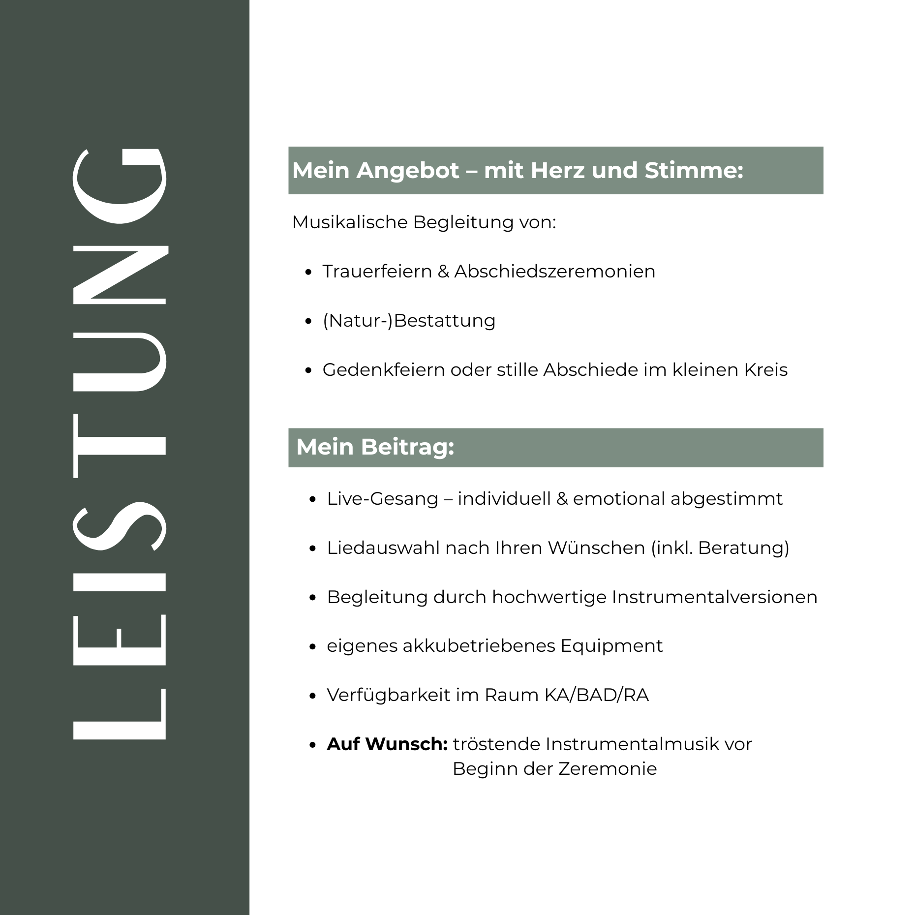 Seit über 10 Jahren bin ich Sängerin. Ich begleite Trauerfeiern mit einfühlsamen Live-Gesang und schenke dabei Momente